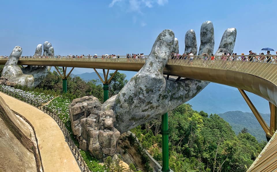 The cable car system has 94 cabins with a total capacity of 1,500 passengers/hour. It takes you about 15-20 minutes to travel by foot from the mountain to the top of Ba Na in a modern cable car. You will have the chance to fly over the spectacular Golden Bridge. The journey to reach the fairy world covered in white clouds is magical.