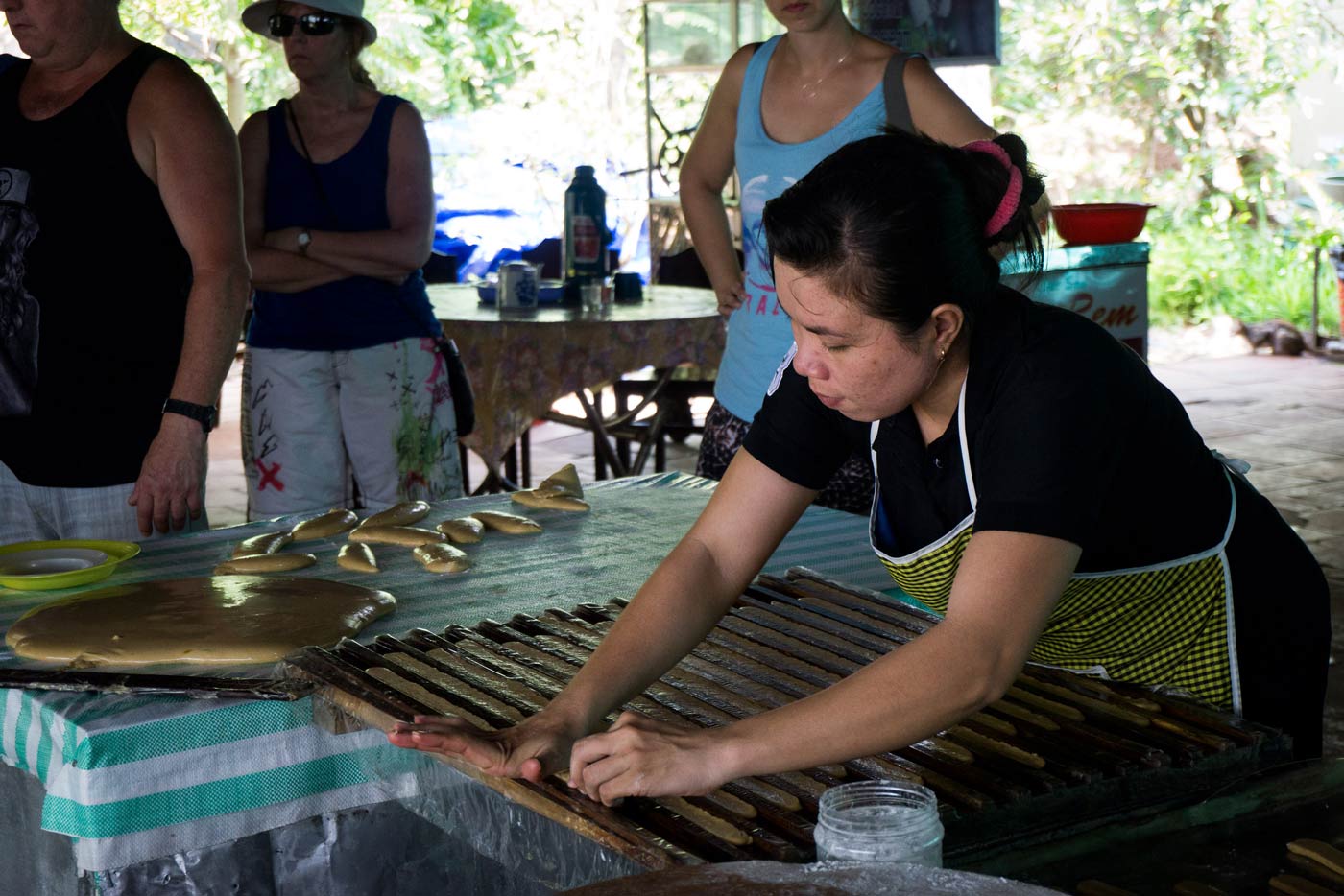 Cruise through the small canal by sampan, treating yourself to the beauty of the countryside, and taking a short cycling around the village which will certainly be an unforgettable experience when participating in the Mekong Delta tour. Visit the coconut candy workshop, and enjoy seasonal delicious fruits & honey tea. Get a chance to listen to the Southern Vietnamese folk music which is performed by local