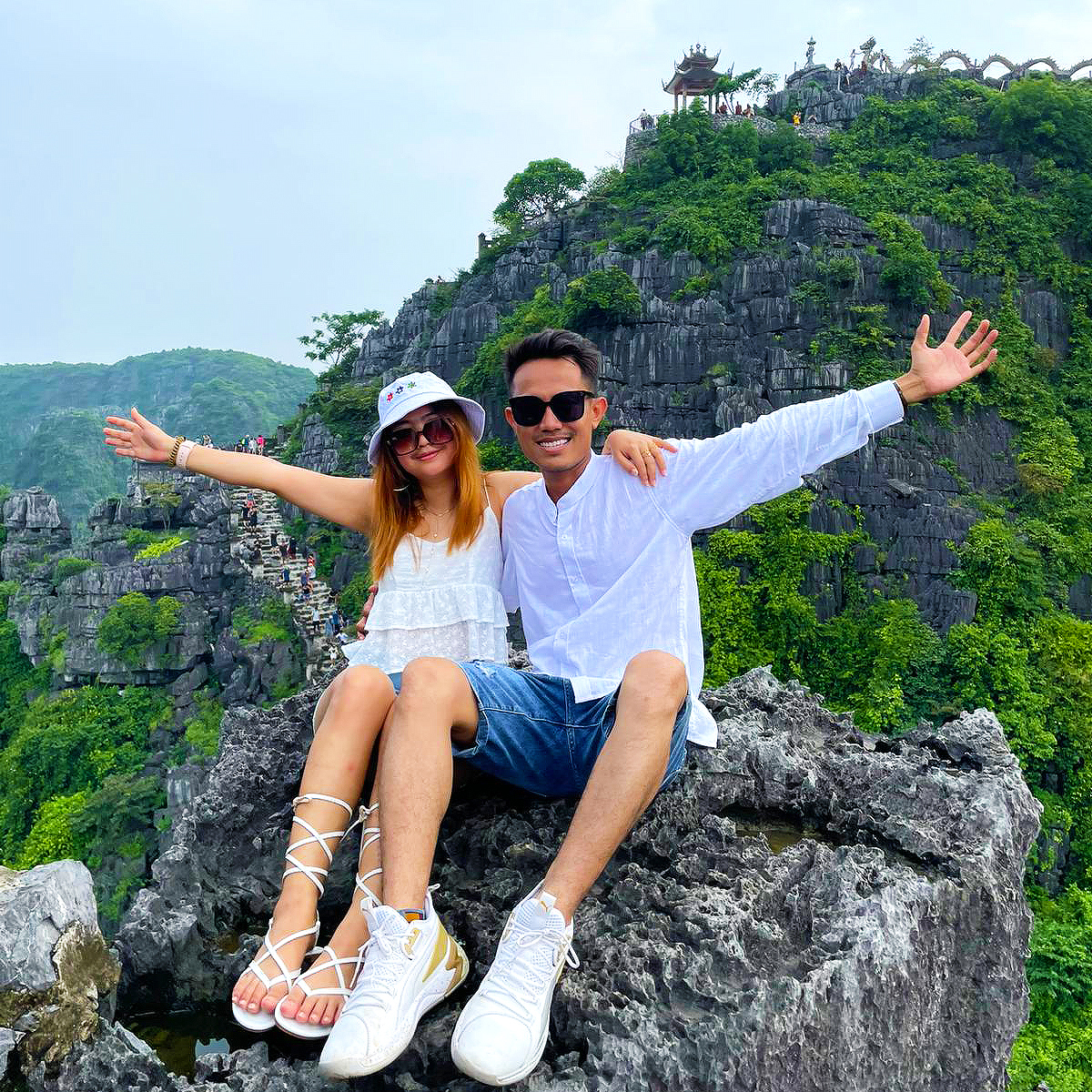 Hiking about 500 steps to conquer Mua Cave peak.