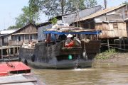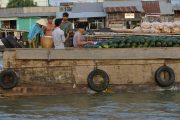 In the very early morning, the river has become a busy commercial site where hundreds of boats packed with fruits, vegetables, plants and foods…line along the river and are ready for trading. Sellers will hang samples of what they are selling on the top of a long pole on their boats so that buyers can see from a distance what sellers are selling.